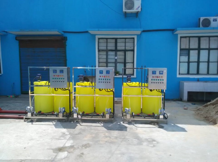 該裝置裝置配帶控制柜,可采用PLC控制或變頻控制。控制柜設(shè)置了低液位停泵、計量泵及攪拌機(jī)故障聲光報警等功能。