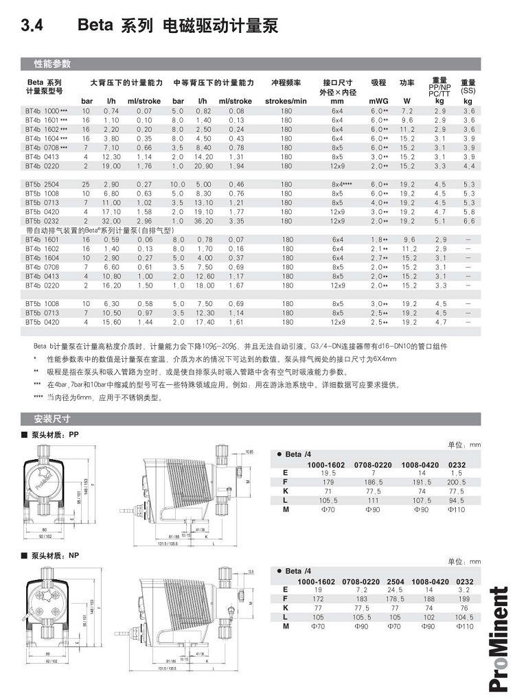 | 性能參數表中的數值是計量泵在室溫,介質為水的情況下可達到的數值。泵頭排氣閥處的接口尺寸為6×4mm。 | |