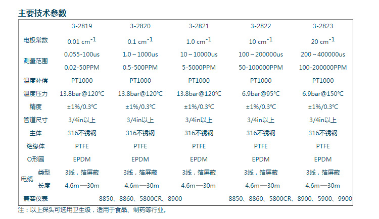 2819-2823電導率/電阻率電極可以采用多種安裝方式,能確保良好的準確度和重復性。標準材料為316不銹鋼或鈦,也可選用其他材料。可選用衛生型法蘭。電極中內置PT1000熱電阻,對溫度進行測量。
