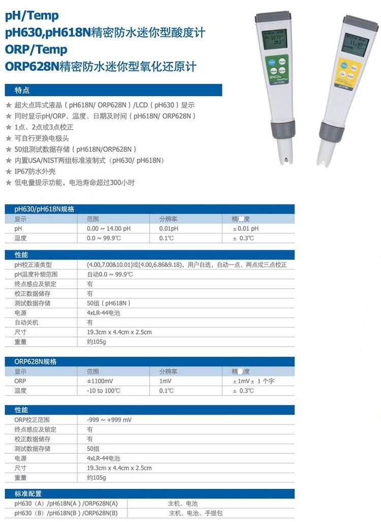 參數(shù):-1200~1200mV/1mV/-999~999mV/1mV(相對值)/IP67防水外殼/可換電極頭/50組數(shù)據(jù)存儲