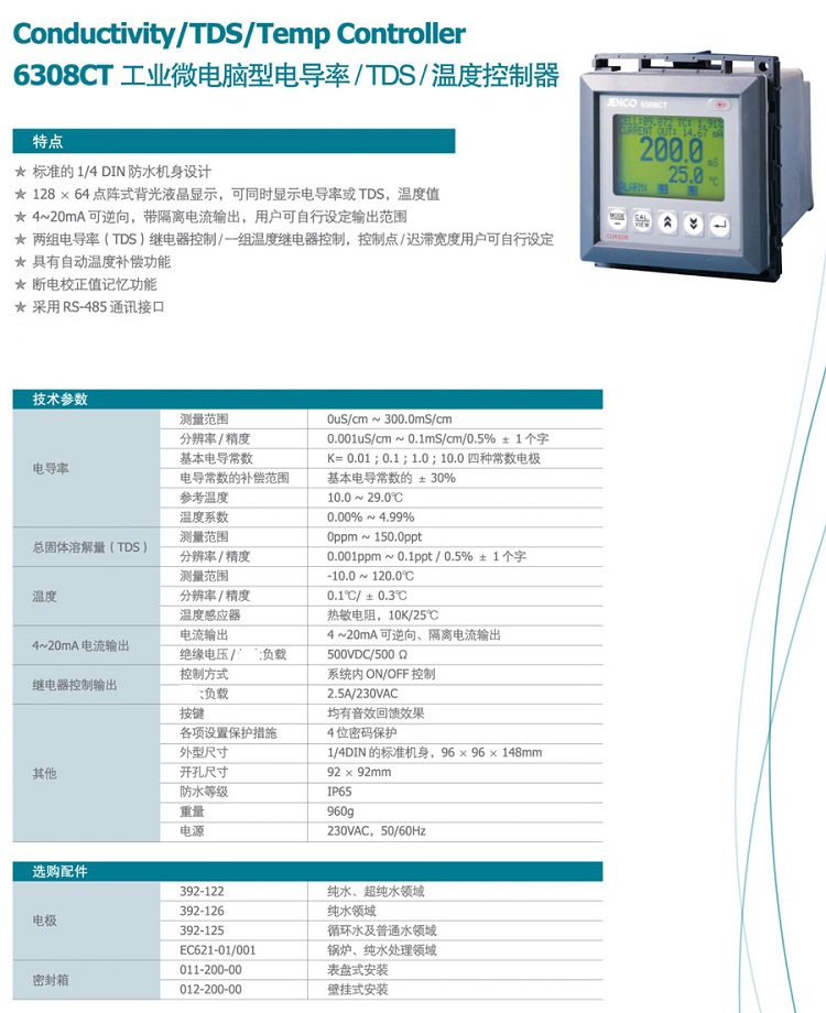 參數:0μS~300.0mS,背光點陣式LCD顯示,防水外殼,4~20mA隔離輸出,三組繼電器控制,RS-485接口