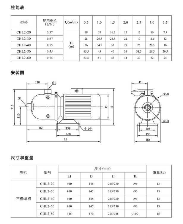 型號 | 揚程 | 功率 | 級數 | 電機功率 | 重量 |