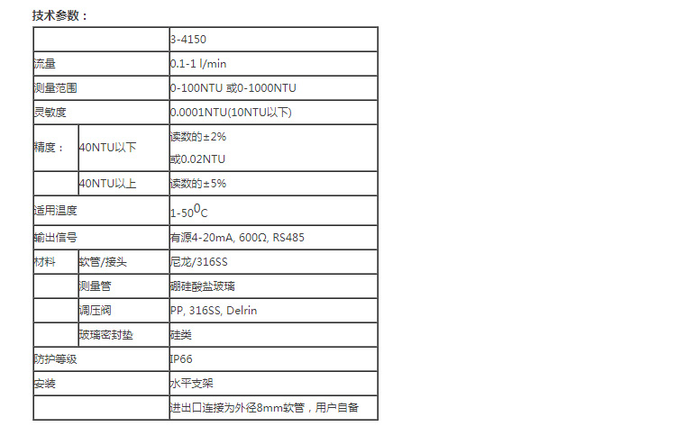 兩種量程可選。0 -100 NTU 型的用于低量程應用,如飲用水監測。0 - 1000 NTU 型的可用于各種場合,如原水、廢水等。