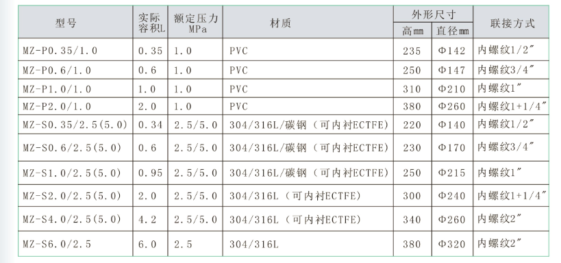 材質有304316、內襯式及PVC等,我公司備有以下型號的產品,可供客戶選擇,若有特殊需求,可單獨訂購。膜片式脈沖阻尼器高使用壓力為:PVC材質的為1.0MPa,金屬材質的為2.5MPa,禁止超壓使用,以免殼體破裂發生危險。使用溫度不高于75。使用溫度不低于5,建議使用溫度10~45。