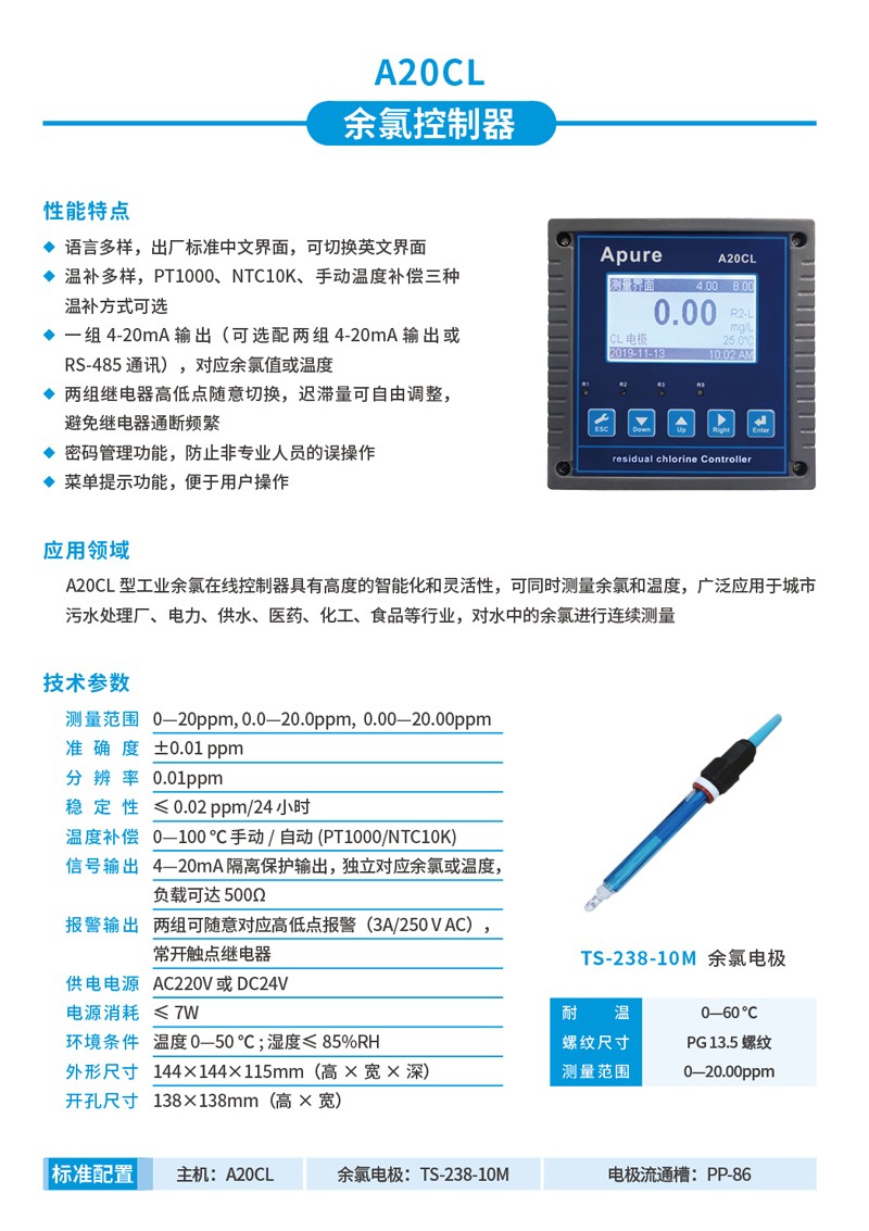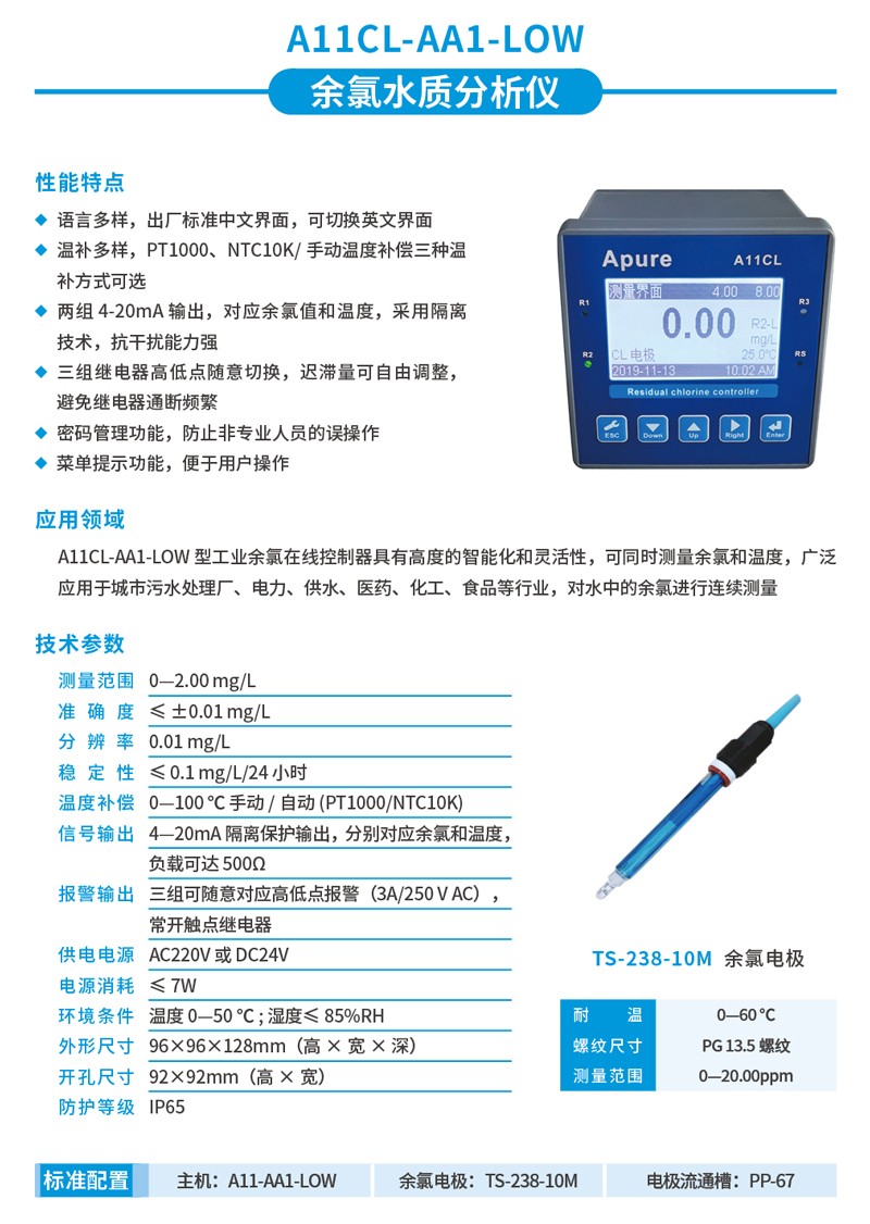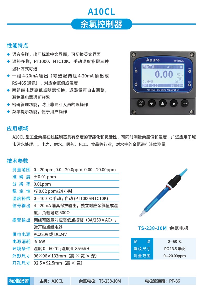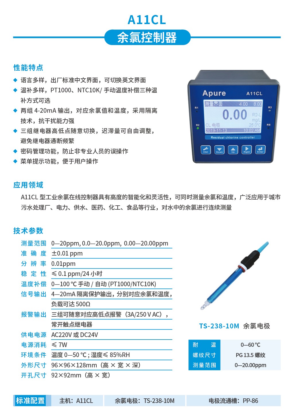Apure余氯儀A10/A11/A20CL工業余氯在線控制器數顯臺式余氯測試儀