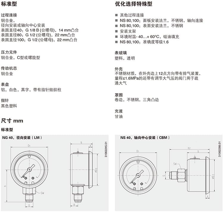 2. 膜片壓力表,化學(xué)工業(yè)型,表頭不充液/充液,高過壓保護壓力表,針對UHP應(yīng)用:422.12 432.50 432.56 423.36 423.25