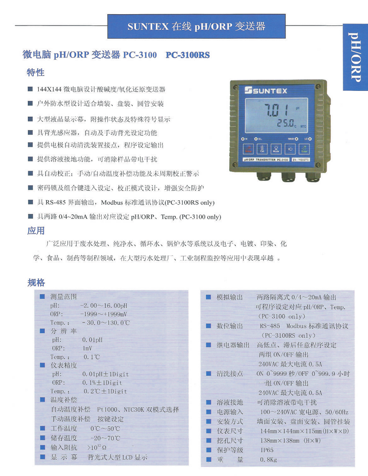SUNTEX PH計PC-3100工業(yè)在線純水PH/ORP變送器配梅特勒405-60-SC電極